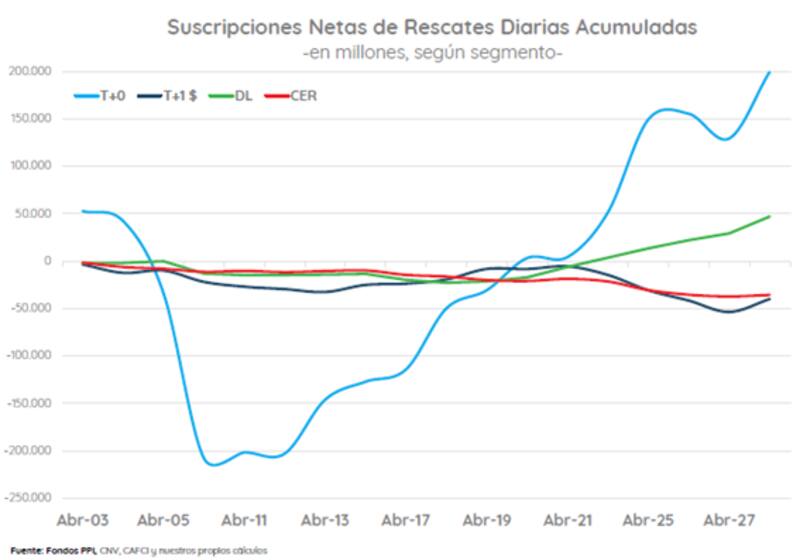 En abril la industria de FCI vio un total de $275.340 millones de suscripciones netas, de los cuales los flujos positivos se dieron en T+0 y dólar linked, mientras que los negativos se dieron en T+1 y CER.