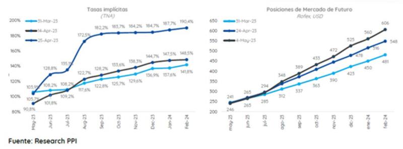 Finalmente, Julio Calcagnino, team leader de TSA Bursátil, remarca que las tasas forward de Rofex sugieren depreciaciones mensuales de dos dígitos entre los meses de julio y noviembre, reflejando puramente las expectativas del mercado.