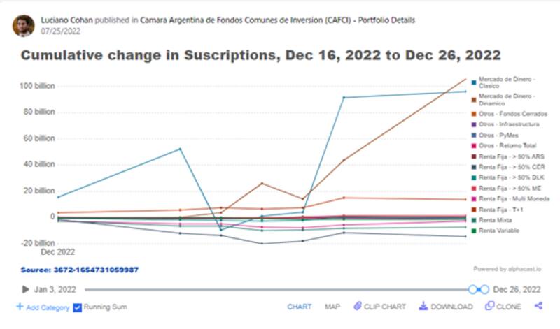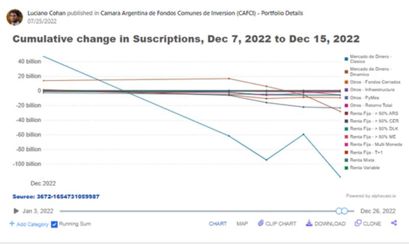 Según datos de Alphacast, durante las segunda semana de diciembre, los fondos money market clásicos sufrieron rescates por $ 118.210 millones, seguidos por los fondos T+0 dinámicos que vieron salidas por $ 27840 millones y los CER con rescates por $ 23.130 millones.