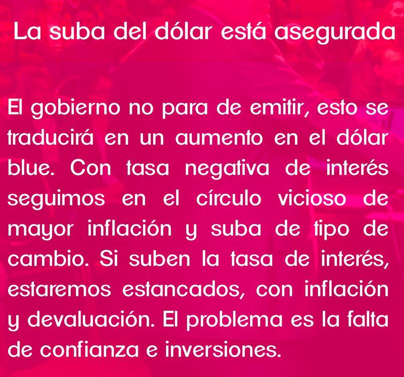 "Un plazo fijo paga una tasa del 34% anual, cuando la inflación de los últimos 12 meses es del 52,1% anual, esto implica una tasa negativa de 18,1 puntos porcentuales. Esta tasa de interés invita al ahorro en dólares y resulta una estafa para el ahorrista en pesos", continuó.
