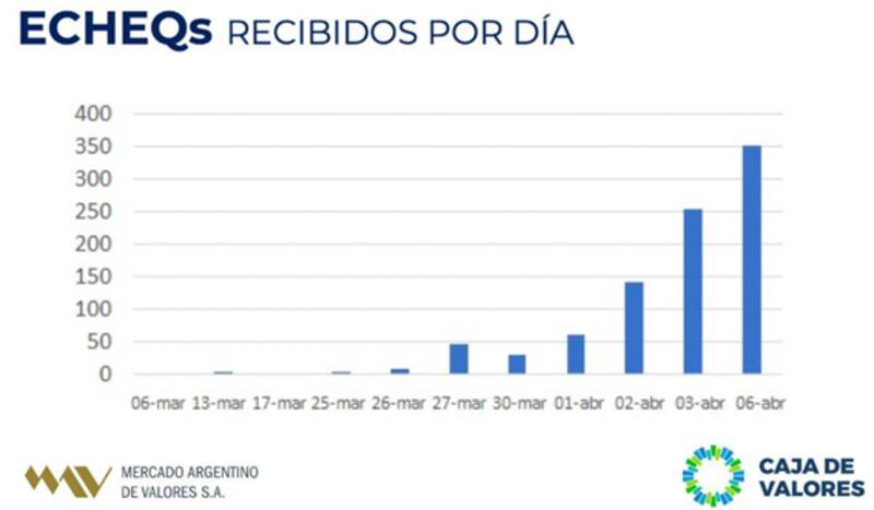 “Desde el pasado 20 de marzo, fecha del inicio del confinamiento, se negociaron más de 1000 cheques electrónicos avalados por SGR, por un monto total superior a los $ 354 millones. Las primeras operaciones del 27 de marzo representaban el 1% del total negociado en dicha fecha. El 7 de abril, el 30% del volumen negociado de cheques avalados se realizó mediante cheques electrónicos , destacó.