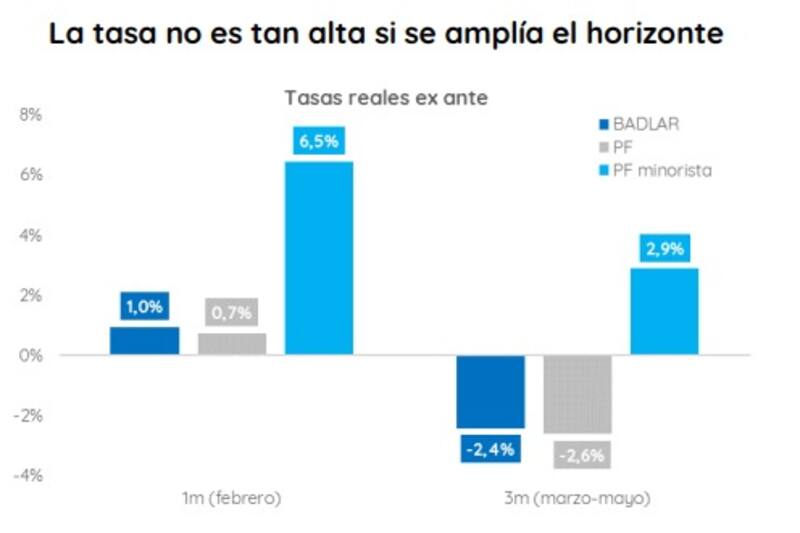 De acuerdo a los cálculos de PPI, las tasas de interés positivas a un mes vista, actualmente con una TEA de BADLAR en 1% y una de plazo fijo total en 0,7%, se vuelven negativas para el trimestre marzo-mayo (-2,4% y -2,6%).