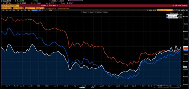 Los rendimientos de los bonos del tesoro americano viene subiendo en las ultimas semanas, y el rally se aceleró tras la victoria de Trump en las elecciones presidenciales en EEUU.