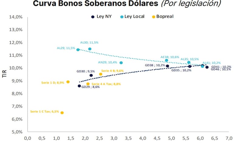 “Los bonos emitidos bajo ley local son los que capturarían una mayor compresión, teniendo en cuenta que mantienen spreads de entre 3% y 4% (su media suele estar en la zona de 2,2%), que debería normalizarse en el escenario de compresión del riesgo país esperado”, dijeron.