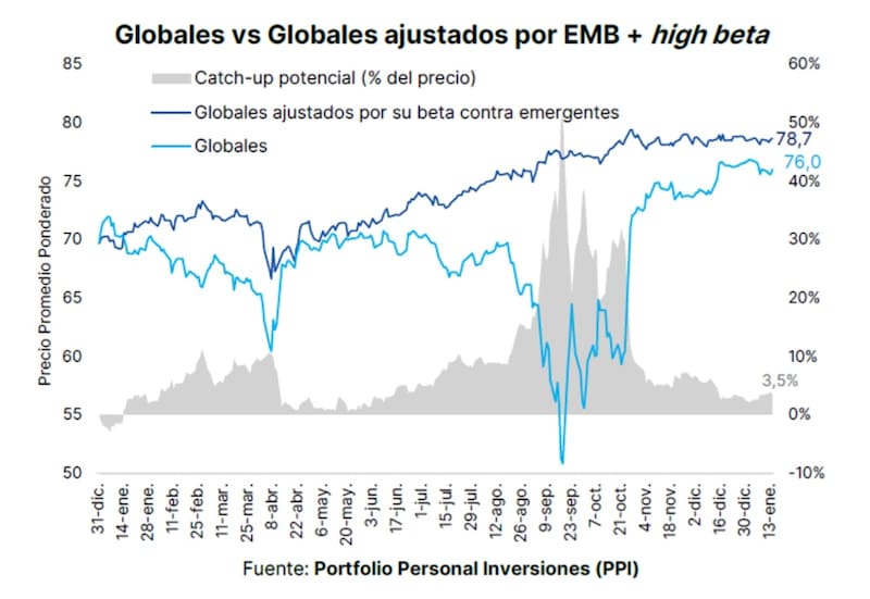Los Globales deberían subir entre 3,5% y 5% en promedio para ajustarse a los mismos precios que el índice de mercados emergentes en dólares.