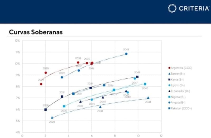 Países como Bahréin, Kenia, Egipto, El Salvador, Nigeria, Angola o Pakistán muestran retornos menores que el de Argentina, de entre 5% y 8% en los distintos tramos de la curva.