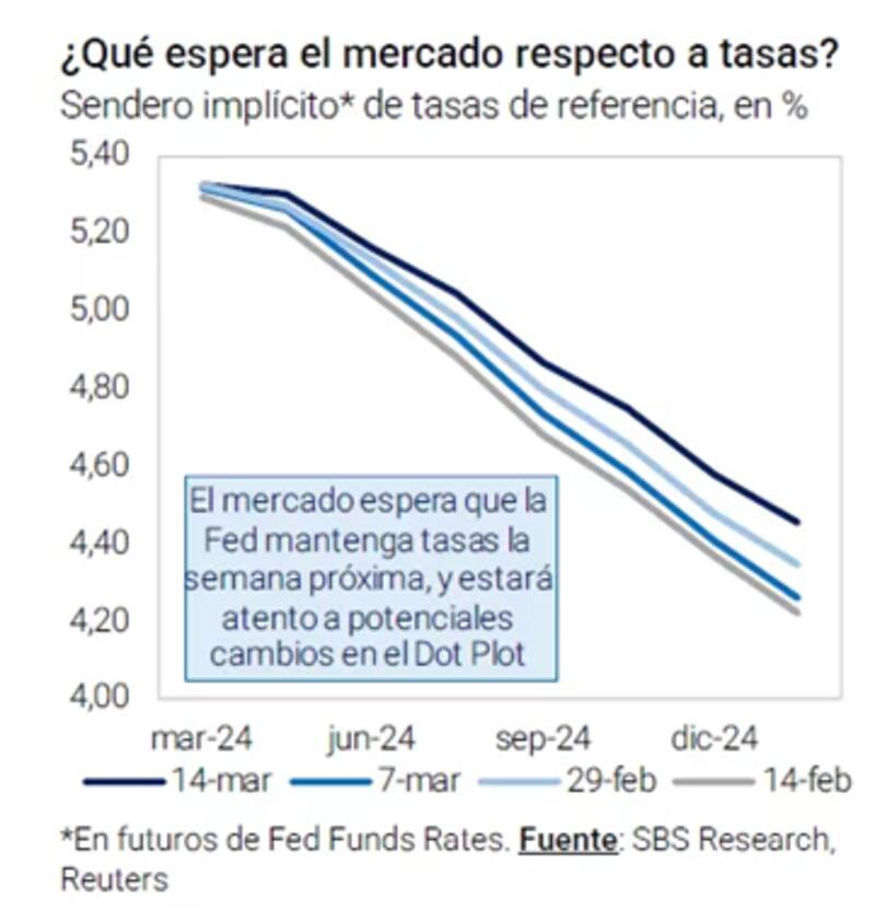 No hay grandes expectativas de cambio en las tasas de interés ya que el mercado especula con un 98% de probabilidad de que la Fed no moverá la tasa mañana, dejando a la misma en el actual rango de 5,25% y 5,5%.