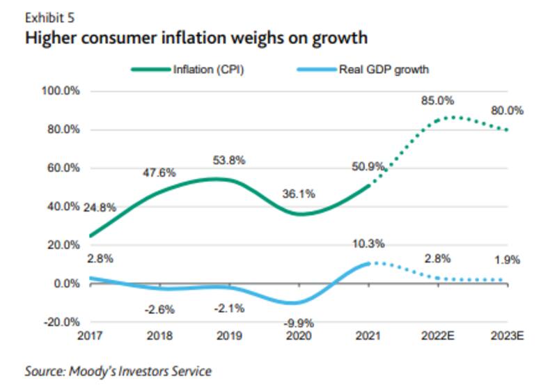 Moody´s hizo su proyección de inflación para el 2022 y 2023, lo que en términos generales, representa una complicación para los créditos corporativos. En particular, esperan que la inflación al consumidor en Argentina se acelere a 85% en 2022 y 80% en 2023, desde 51% en 2021.