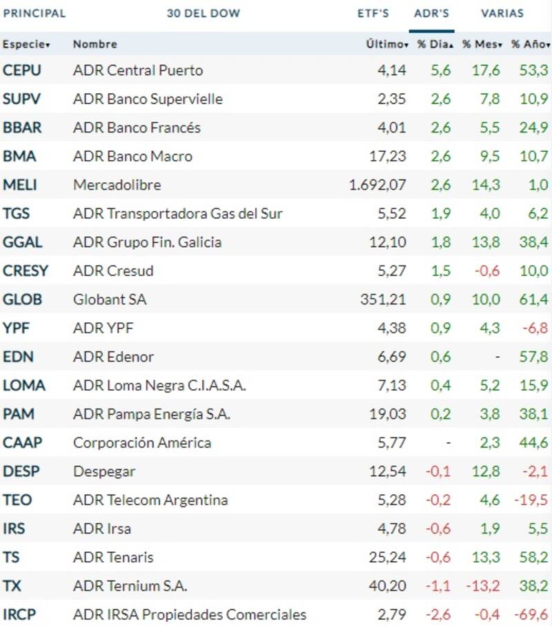 Pasado el mediodía, los ADR argentinos operaban mayormente en verde, con Central Puerto a la cabeza, que mostraba una suba de 5,6%, seguido por el sector financiero, que registraba avances de 2,6% en los bancos Supervielle, Francés y Macro, mientas las mayores bajas se daban en Irsa (-2,6%) y Ternium (-1,1%).