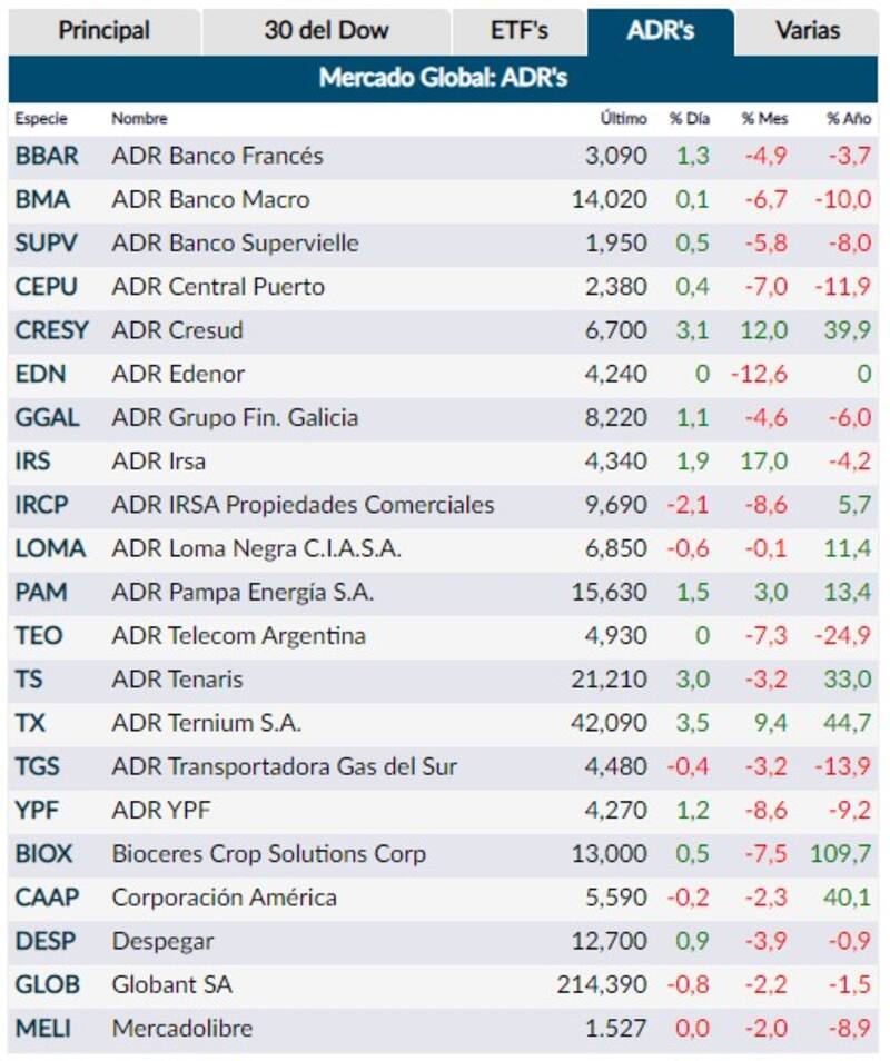 Este comportamiento positivo se extiende también para las acciones de las compañías argentinas. Los ADR locales muestran mayoría de mejoras, y avanzan hasta 3,5% liderados por los papeles de Ternium. De cerca los siguen Cresud y Tenaris, con subas respectivas de 3,1% y 3%.