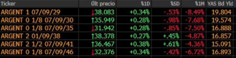 El castigo que vienen acumulando los bonos locales, sin embargo, puede verse con mayor nitidez en el acumulado del último mes, período en el que las pérdidas oscilan entre 4,3% y 8,5%. Y también se refleja en el hecho de que sus rendimientos volvieron a quedar a las puertas del 20%.