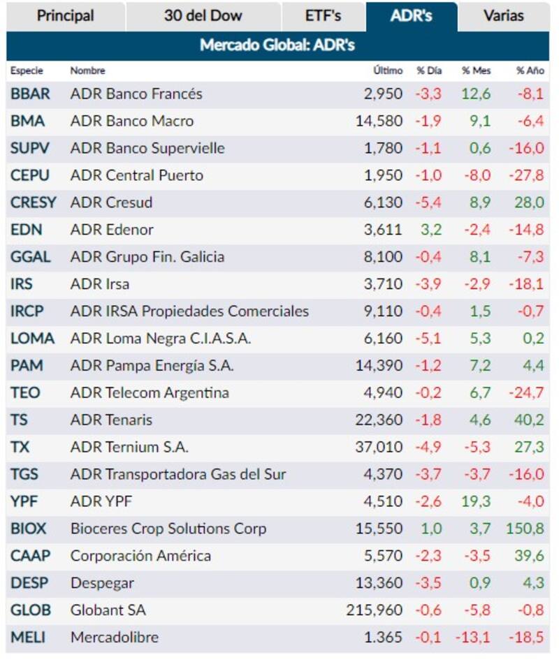 Los ADR locales, en tanto, anotaron caídas que llegaban hasta casi un 5,5% Excepto por Edenor, que avanzó 3,2%, y por Bioceres, que subió 1%, todos los demás ADR finalizaron la rueda en rojo. Las bajas fueron lideradas por los papeles de Cresud, Loma Negra y Ternium, que cerraron con caídas de 5,4%, 5,1% y 4,9%, respectivamente, mientras que la baja más moderada fue la de Mercado Libre, que cayó 0,1%.