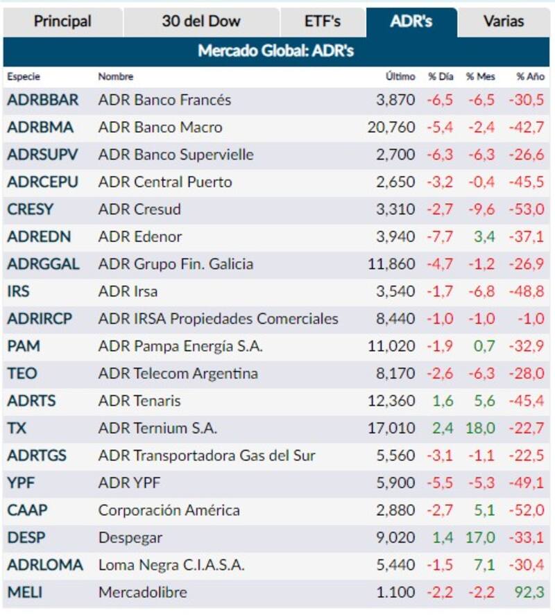 Los ADR locales cerraron en rojo. Fuente: Rava.