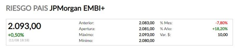 Esta leve desmejora de los bonos se reflejó en el riesgo país. El índice que mide JP Morgan, que cayó la semana última a su nivel más bajo desde mediados de febrero, sumó 10 unidades hasta los 2093 puntos básicos.