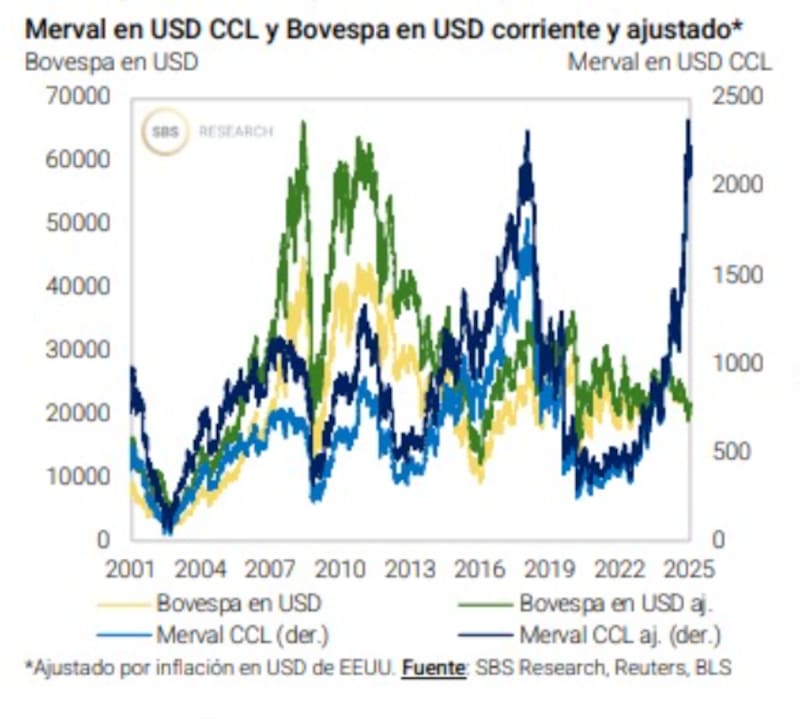 "Una mirada al desempeño reciente del equity argentino y brasileño, muestra una superlativa performance local y magra para el país vecino. La mala performance obedece a cuestiones fiscales y el mercado espera que, si eso se acomodara en Brasil, podríamos ver un interesante rally hacia adelante", describió.