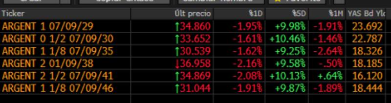Entre los Globales el que peor la pasó fue el GD38 (-2,16%), en tanto que el GD30 bajó un 1,61 por ciento.