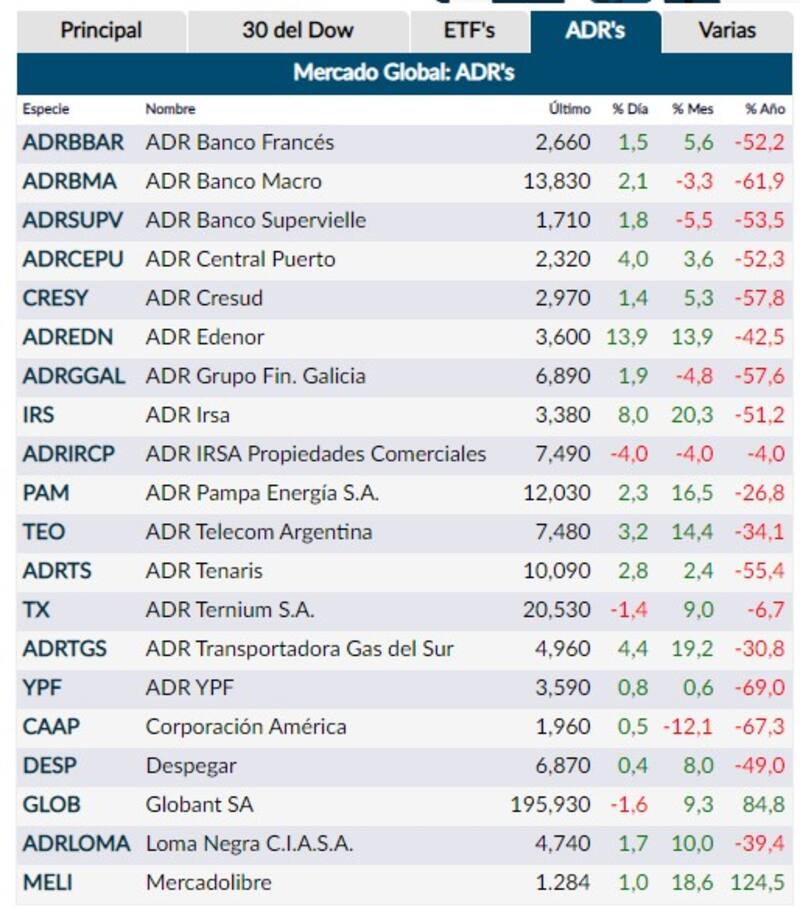 Fuertes avances de los ADR locales en el inicio de la semana. Fuente: Rava