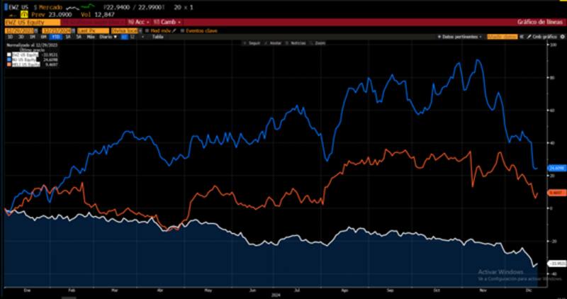 Milo Farro, analista en Rava Bursátil, explicó que el déficit fiscal del 9,5% del PBI, la inestabilidad cambiaria del real y el aumento de las tasas de largo plazo en Estados Unidos desencadenaron un 2024 adverso para las acciones de Brasil.