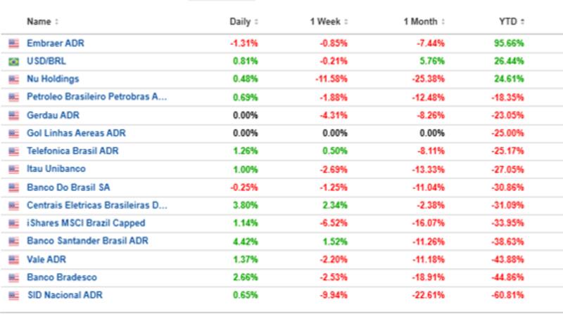 Los papeles que caen menos que el EWZ son Petrobras (21%), Gol (25%), Gerdau (27%), Itaú (27%), Telefónica (28%), Banco do Brasil (30%) y Centrais Electricas (31%).