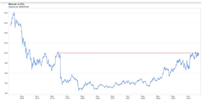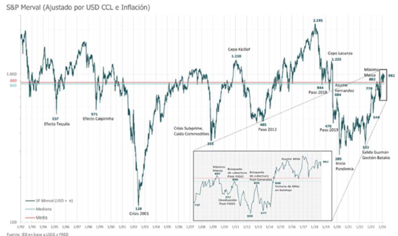 El S&P Merval en dólares se ubica en u$s 984 y choca con la barrera de los u$s 1000, la cual es un importante escollo a superar de largo plazo para las acciones.