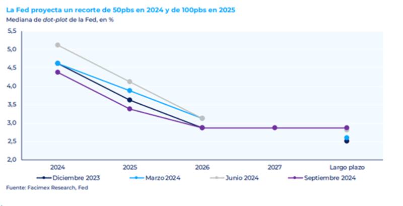 Los analistas de Facimex Valores coincidieron en que mercado es un poco más agresivo en cuanto al futuro de las bajas de tasas, respecto de la Fed, ya que espera que los recortes totalicen los 200pbs hasta fines de 2025.