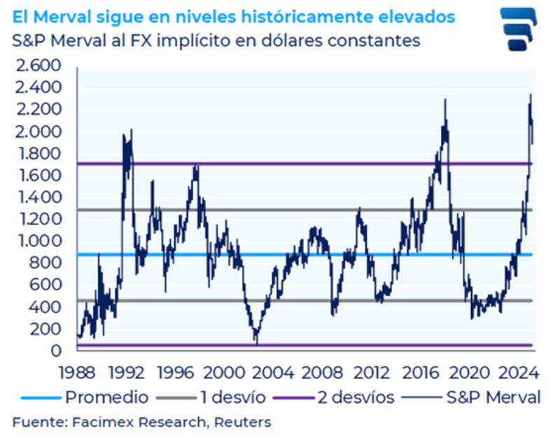 Los analistas de Facimex Valores indicaron que, si bien el Merval corrigió desde máximos históricos, aún sigue arriba de dos desvíos por encima de su promedio histórico de largo plazo (desde 1988) en dólares constantes, mostrando cierta sobrevaluación.