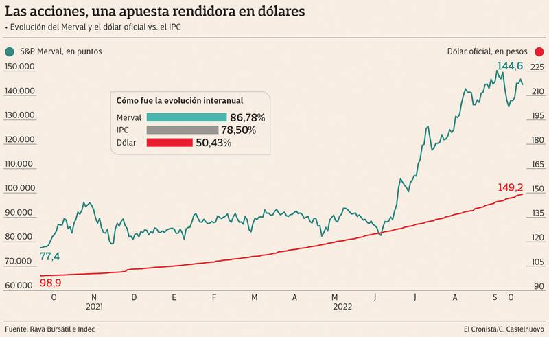 El S&P Merval muestra un alza de 73% en lo que va del 2022 pero esa variación está contaminada por la alta inflación en el país. En dólares igualmente la ganancia es del 18% arriba mencionado.