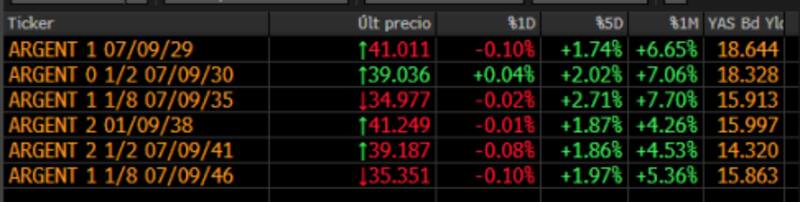 Tras las fuertes subas recientes, los bonos han logrado recuperar posiciones y evidencian subas en el último mes de hasta 7,7%.Pese a ello, los títulos argentinos de ley Nueva York todavía rinden en torno al 19% en la parte corta y al 15% en la parte más larga.