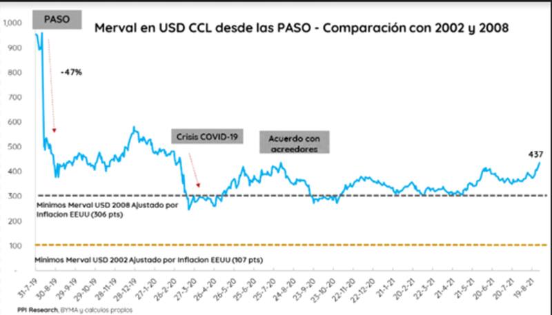 En el día de ayer, el Merval en dólares creció un 5,5% y cerró en 437 puntos, máximos desde la pandemia y acercándose a los niveles previos. En lo que va del mes, acumula un alza del 20,5% mientras que en el año la suba es similar, del 21,5%.