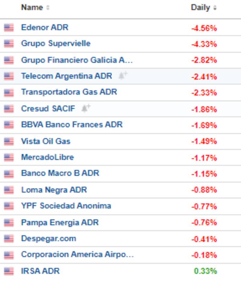 Las acciones argentinas operan a la baja el martes. Edenor y Grupo Supervielle caen mas del 4%, Grupo Financiero Galicia, Telecom y TGS pierden mas del 2%, mientras que Cresud, BBVA Argentina, Vista, MercadoLibre y Banco Macro retroceden más del 1%.