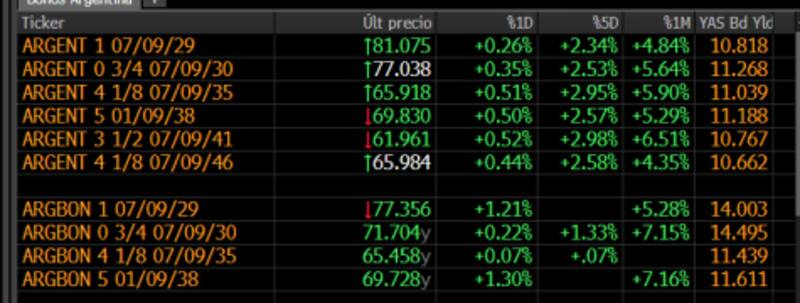 Finalmente, los títulos del tramo medio muestran ganancias de 0,5% y 0,44% para los bonos a 2041 y 2046.