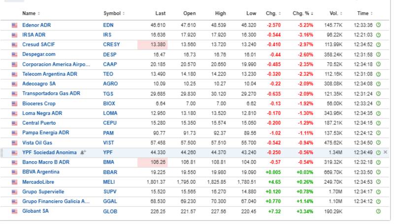 Las mayores bajas se dan en Edenor, que retrocede 5,2%, mientras que IRSA, Cresud, Despegar, Corporación América, Telecom, Adeco Agro, TGS y Bioceres muestran mermas de entre 2% y 3%.