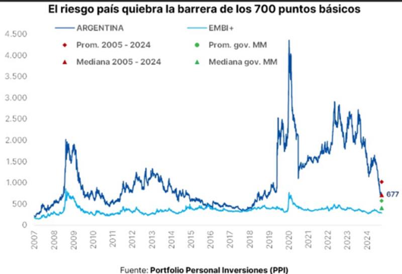 Gracias a la suba de los bonos, el riesgo país sigue apuntando a la baja. Ayer el mismo quebró los 700 puntos y el mismo se ubica cerca del promedio de la gestión de Macri.