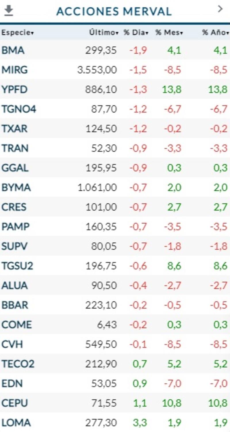 El S&P Merval retrocedió 0,5% en pesos y 1% en dólares. Con gran parte del panel líder en rojo, la mayor caída de la jornada fue la de Banco Macro, que registró un descenso de más de 1,9%, seguida por las acciones de Mirgor e YPF, que anotaron bajas de 1,5% y 1,3%, respectivamente.