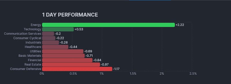 Entre los 11 sectores principales del S&P 500, el de consumo básico registró la mayor caída porcentual, mientras que energía fue el claro ganador de la jornada al avanzar 2,5%, impulsado por la suba del precio del crudo.