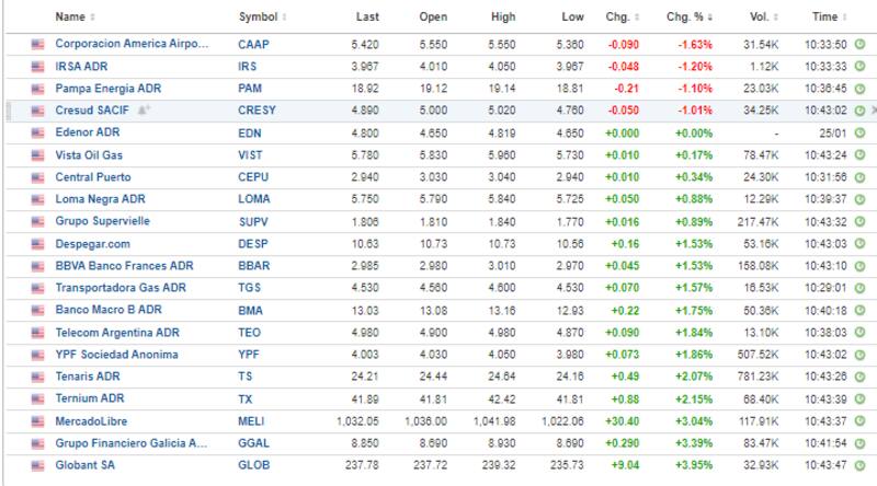 Las acciones argentinas en Wall Street operan mixtas. Corporación América, IRSA. Pampa y Cresud operan a la baja, con caídas de entre 1% y 1,6%.