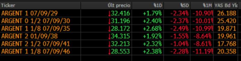 Los Globales 2029 y 2030 suben 1,8% y 2,4% respectivamente, mientras que la parte media avanza 2,7% y 1,9% en el caso de los Globales 2035 y 2038. Finalmente, en el extremo más lago, la deuda sube 2,4% en el Global 2041 y 2,3% en el caso del Global 2046.