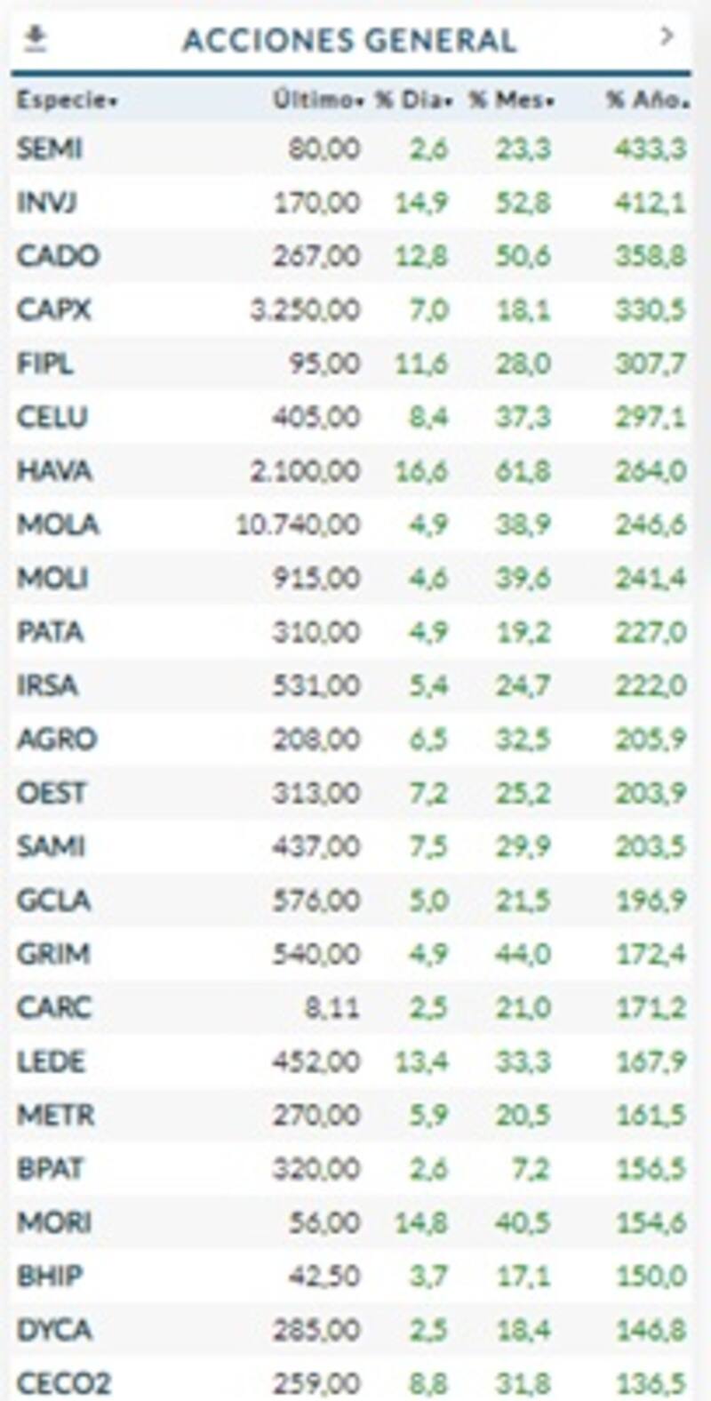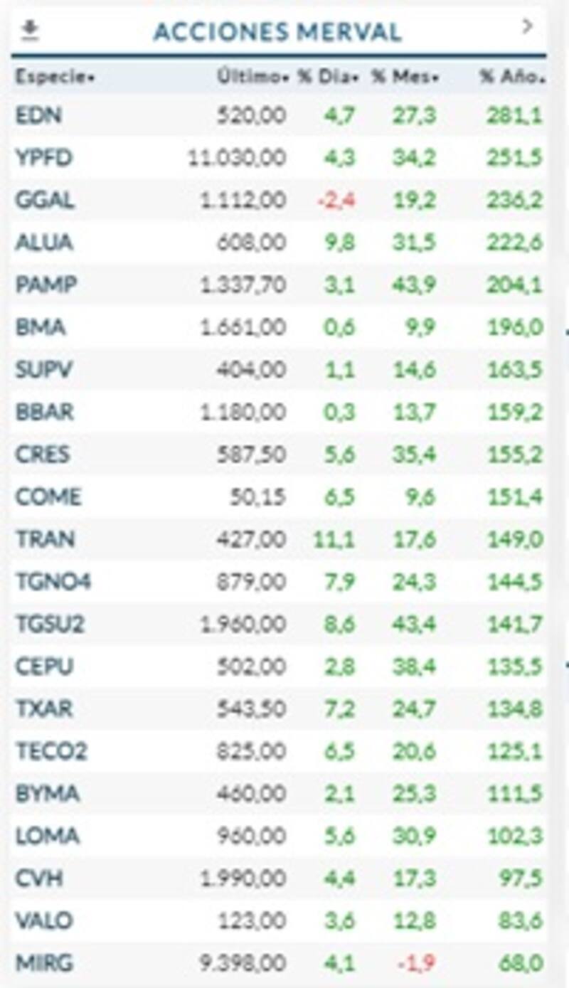 Otras acciones como Aluar, Pampa, Banco Macro, Grupo Supervielle, BBVA Argentina, Cresud, Comercial del Plata, Transener, TGN, TGS, Central Puerto, Ternium, Telecom, BYMA y Loma Negra, también muestran avances de tres dígitos, con subas de entre 102% y hasta 222%
