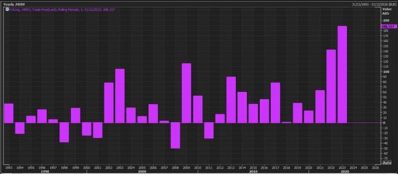 En línea con lo que menciona Mazza, el índice S&P Merval en pesos está teniendo su mejor año de al menos 1993.
