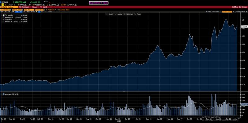 Mauro Natalucci, analista en Rava Bursátil, explicó que durante el 2023 el Merval ganó más de 350% en pesos y el CCL subió poco más de 180%, en un contexto en el que la tasa inflacionaria es de aproximadamente 200% interanual.