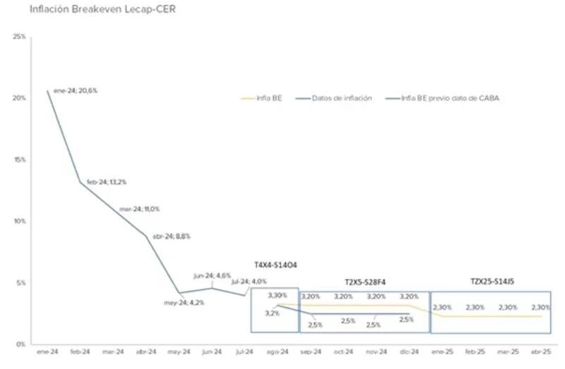 Actualmente, el mercado tiene incorporado una inflación break even entre Lecap y CER esperada para agosto de 3,3%, para situarse luego en niveles de 2,5% para el último cuatrimestre del año.