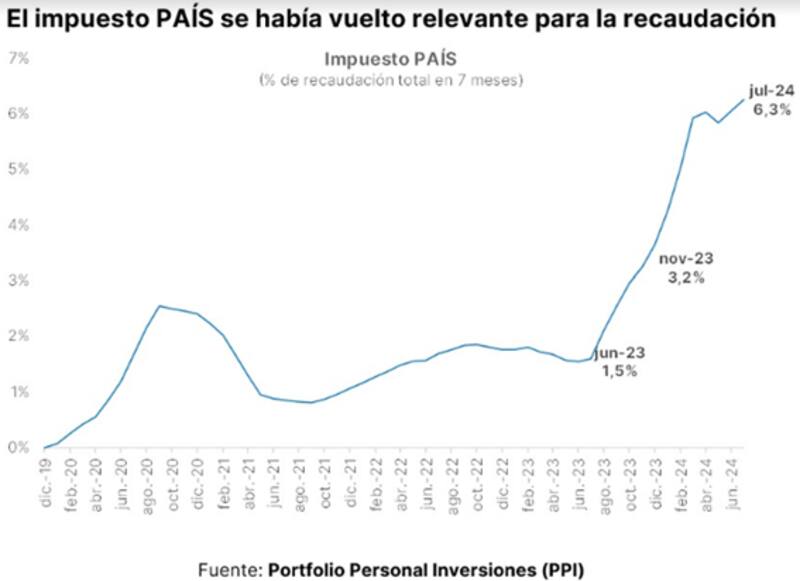 "Hasta ahora, el Impuesto PAIS aportó 0,7 puntos del PBI, con una recaudación de aproximadamente $ 698.351 millones en el último mes y acumulando cerca de $ 4,3 billones en lo que va del año. Esto representa un aumento en términos reales de la recaudación acumulada del 373%", detallaron.