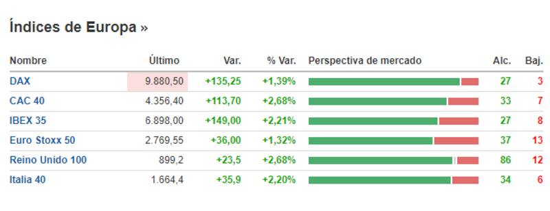 Así, en Londres, el Ftse 100 trepa 4,17%; en Frankfurt, el Dax asciende 4,18% y en Paris el CAC asciende 4,48%.