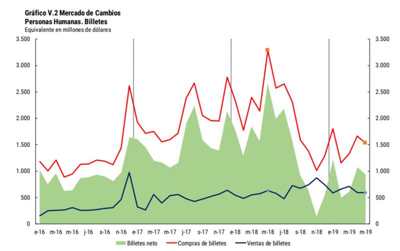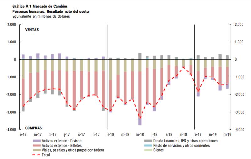 "Las personas humanas, que básicamente demandan moneda extranjera para atesoramiento y viajes al exterior, compraron de forma neta u$s 1425 millones (u$s 938 millones por billetes y u$s 487 millones por el resto de sus operaciones), monto que mostró un descenso de 58% respecto a las compras por u$s 3365 millones de mayo de 2018", detalló el Informe de la Evolución del Mercado de Cambios y Balance Cambiario de mayo publicado hoy.