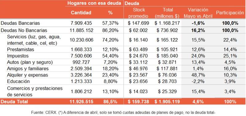 Según el informe del Centro de Economía Regional y Experimental (CERX), que aportó los números luego de cruzar los datos del Banco Central con una encuesta que realizó entre 6770 hogares entre el 22 y 25 de junio, las deudas no bancarias son las que más preocupan "por la cadena de eslabones sin cobrar que quedan detrás de ella".