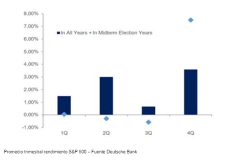 Según este informe, desde 1966 a la fecha, el S&P500 generó siempre un avance positivo un año después de las elecciones de medio término. De hecho, históricamente, no se han visto caídas para los índices americanos un año después de estas elecciones.
