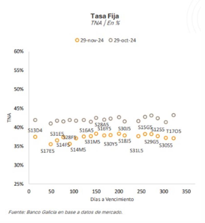 Hoy la curva de Lecap opera con tasas de entre 37% y 35% (TNA) en todos los tramos, habiendo comprimido respecto de los niveles por encima de 40% que operaba hace un mes atrás.