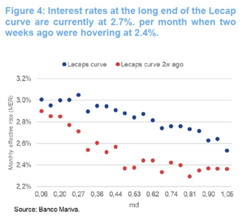 Hoy la curva de Lecap opera con tasas de 2,9% en el tramo corto, cayendo al 2,6% en el tramo medio y 2,7% en el tramo más largo.