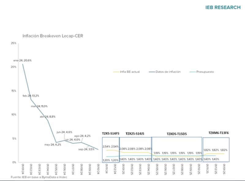 "La inflación implícita para los próximos meses se estima en 2,4% para noviembre y 1,8% para diciembre, mientras que la mayoría de los relevamientos de precios indican que la inflación de noviembre se ubicaría entre el 2,7% y el 2,9%. Por ello, para quienes deseen posicionarse en el tramo corto de las curvas, preferimos los CER, ya que en un escenario optimista ofrecen rendimientos similares a los instrumentos de tasa fija, pero con la ventaja adicional de cobertura frente a eventuales saltos en los niveles de precios", dijeron.
