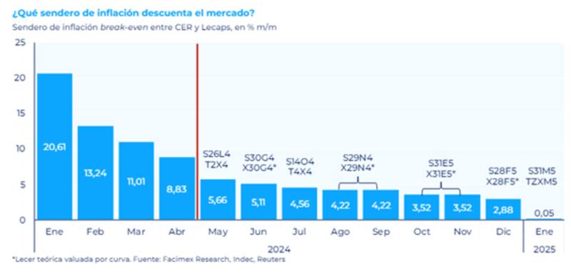 "Esto es lo que surge al comparar la curva de Lecaps contra la curva CER para calcular la inflación que deja a un inversor indiferente entre estar posicionado en CER o Lecaps. Para los cálculos construimos Lecer teóricas valuadas por curva en aquellos casos donde no existen instrumentos CER con la misma fecha de vencimiento que las Lecaps, lo que permitió armar un sendero de inflación para los próximos meses", explicaron.
